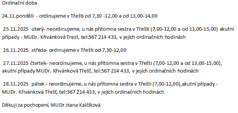 MUDr. Kalčíková dovolená 24.11.-28.11.2025
